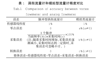 渦街流量計的旋渦分離頻率是與體積流量的大小成正比的,且分離頻率不受流體組分、密度、壓力溫度的影響。只要測量出旋渦個數(shù),就可以準(zhǔn)確計算出體積流量,而旋渦個數(shù)的測量是純數(shù)字概念,不存在測量數(shù)值上的誤差,讓渦街流量計具有了全量程范圍內(nèi)流量信號精確的特點,是其它模擬類流量計不可比擬的優(yōu)點。傳感器線性均為18的脈沖型渦街和模擬類流量計精度對比如表1所示。
