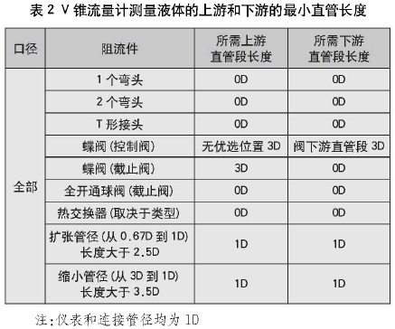 (2)液體測量,雷諾數(shù)范圍(Re)>200000,V錐流量計測量液體的上游和下游的最小直管長度見表2。若≥0.65,表中的直管段長度需要增加1D.。