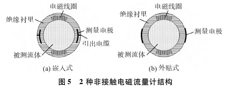 非接觸式電磁流量計(jì)的電極與被測(cè)流體間有絕緣襯里隔離或者直接采用絕緣測(cè)量管。電極貼于測(cè)量管外面或鑲嵌于測(cè)量管內(nèi)部。非接觸式電磁流量計(jì)利用電極與被測(cè)流體通過(guò)絕緣襯里形成耦合電容來(lái)檢測(cè)被測(cè)流體流量信號(hào)。主要結(jié)構(gòu)形式按電極的安裝位置可分為兩種:電極嵌人測(cè)量管絕緣襯里(嵌人式)、電極貼在測(cè)量管外(外貼式)。嵌入式電磁流量計(jì)和外貼式電磁流量計(jì)的結(jié)構(gòu)如圖5所示,嵌人式結(jié)構(gòu)和普通電磁流量計(jì)電極結(jié)構(gòu)類(lèi)似,而外貼式多是采用陶瓷表面金屬化將電極貼在流量計(jì)測(cè)量管外部。