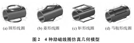 工業(yè)生產(chǎn)中廣泛應(yīng)用的勵(lì)磁線(xiàn)圈的形狀主要有圓形線(xiàn)圈、菱形線(xiàn)圈矩形線(xiàn)圈、馬鞍形線(xiàn)圈等。4種勵(lì)磁線(xiàn)圈的仿真幾何模型如圖2所示。典型的線(xiàn)圈結(jié)構(gòu)仍存在一些不足,如亥姆霍茲線(xiàn)圈中部的工作磁場(chǎng)均勻度較好,而邊緣處磁場(chǎng)卻減弱;菱形勵(lì)磁線(xiàn)圈和矩形勵(lì)磁線(xiàn)圈產(chǎn)生的工作磁場(chǎng)在電極附近的分布均勻度較差;馬鞍形勵(lì)磁線(xiàn)圈的磁場(chǎng).均勻度最好,但輸出感應(yīng)電動(dòng)勢(shì)大小比亥姆霍茲線(xiàn)圈低。