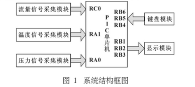 渦輪流量計系統(tǒng)以PIC單片機(jī)為控制核心,包括流量信號采集模塊、溫度和壓力信號采集模塊、鍵盤以及顯示模塊5個部分。流量信號采集模塊使用渦輪流量計采集流量信號,經(jīng)過外圍電路處理后送入單片機(jī),測量其頻率,用于流量計算;溫度和壓力采集模塊將采.集到的溫度和壓力通過A/D轉(zhuǎn)換后送入單片機(jī),用.于氣體的密度計算,對氣體流量進(jìn)行補(bǔ)償;鍵盤模塊實(shí)現(xiàn)對儀表參數(shù)的設(shè)置、各顯示內(nèi)容之間的轉(zhuǎn)換操作;顯示模塊實(shí)現(xiàn)瞬時流量、累積流量、溫度和壓力的顯示。系統(tǒng)的總體結(jié)構(gòu)圖如圖1所示。