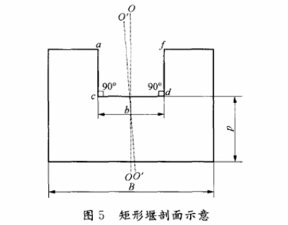 1}矩形缺口中垂線應與行近渠槽中心線相重合,側緣(ac,fd)與底緣(cd)交角為90°,如圖5所示。