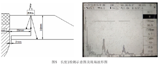利用流量計直探頭得到兩個回波信號(分別為環(huán)室反射信號、平底反射信號),根據(jù)超聲波大平底面回波聲壓與距離的反比關(guān)系,△12=201gx2/x1,以DG1為例,計算出兩個回波差值△=5db,根據(jù)閘門移動或設置雙閘門,比較回波的db差值,來判斷直探頭發(fā)射點是否處在環(huán)室的邊緣。最后通過鋼直尺測量焊縫邊緣與探頭中心的水平距離,即得到環(huán)室長度1。
