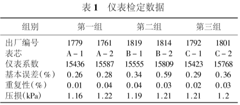 按照規(guī)定,渦輪流量計出廠前總是逐臺進(jìn)行標(biāo)定,并給出儀表系數(shù)。但在現(xiàn)場,尤其是高壓場合,渦輪表損壞的事時有發(fā)生,維修人員經(jīng)常將表芯(包括葉輪和軸承在內(nèi)的組件)更換,而不是整臺儀表更換,換下的表芯帶回維修(在現(xiàn)場不允許進(jìn)行長時間的維修工作)。由此產(chǎn)生了這樣的疑問:整臺儀表更換與只更換表芯在流量計的性能方面,尤其是儀表系數(shù)會有什么變化?儀表系數(shù)究.竟和哪些因素有關(guān)?帶著對這些問題的思考,我們隨機抽取了6臺儀表(口徑均為DN80),每兩臺儀表組成一組,共3組進(jìn)行對比試驗。6臺儀表檢定數(shù)據(jù)列于表1。