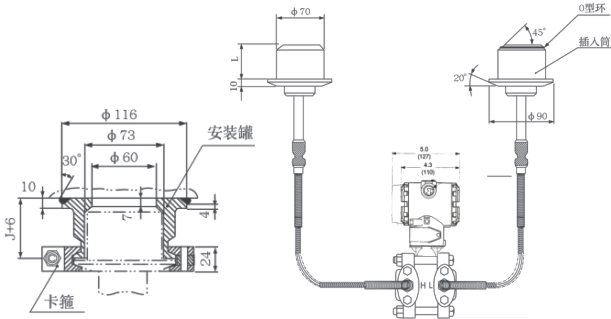 ② 遠傳裝置的工作溫度,由所選擇的灌充液種類確定。 ③ 遠傳差壓變送器的介質溫度影響是指兩側的遠傳裝置由室溫開始同時受到相同的溫度作用,所產生的輸出變化。 ④ 靜壓和溫度影響,均是在最大量程時測得。 ⑤ DP型遠傳差壓變送器兩側的毛細管最大長度為7.5米,兩側長度差為4.5米。 平法蘭(RFW)遠傳差壓變送器